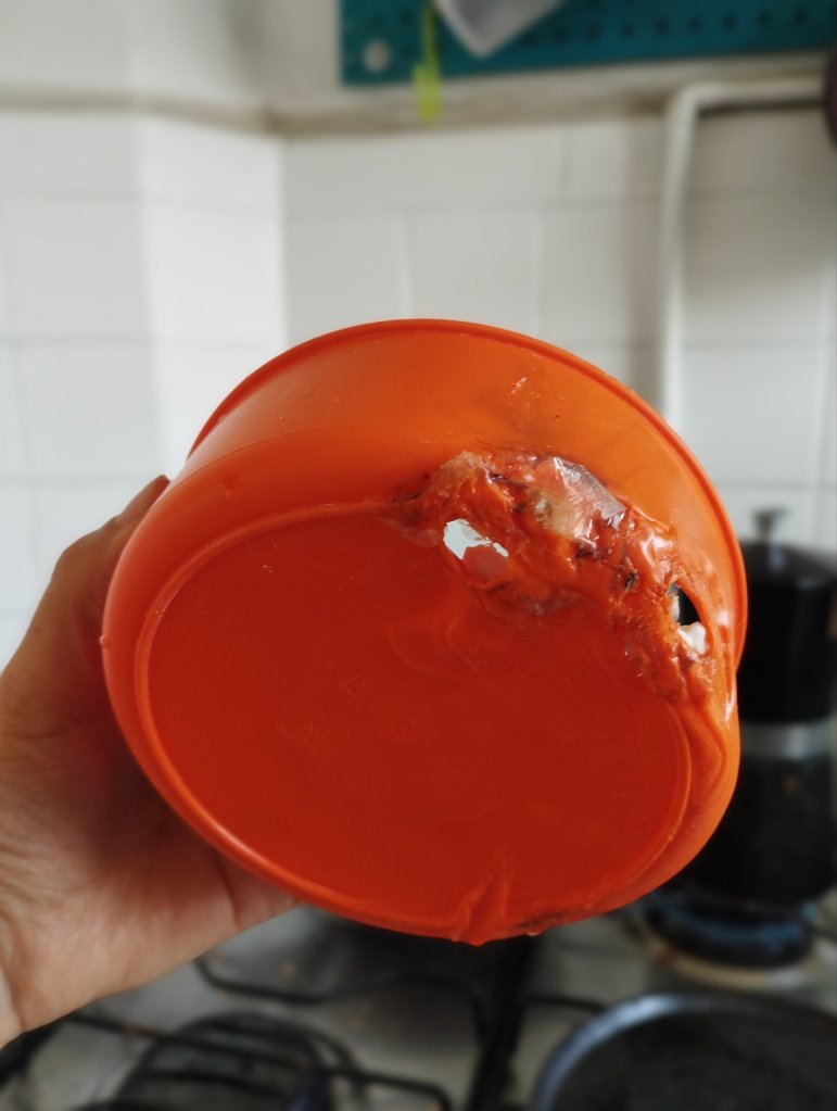Dejé un traste de plástico directamente sobre la lumbre como por un minuto. Reaccioné cuando me llegó el olor a quemado, lo vi sobre la parrilla, derritiéndose y grité «¡por qué hice esto!» Al último lo quité.