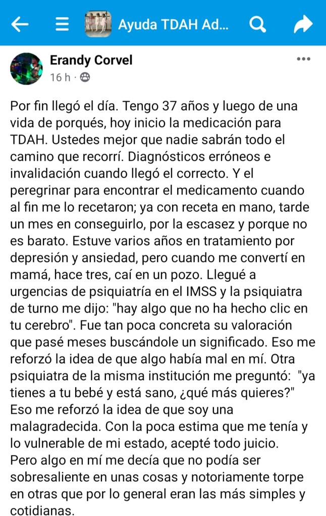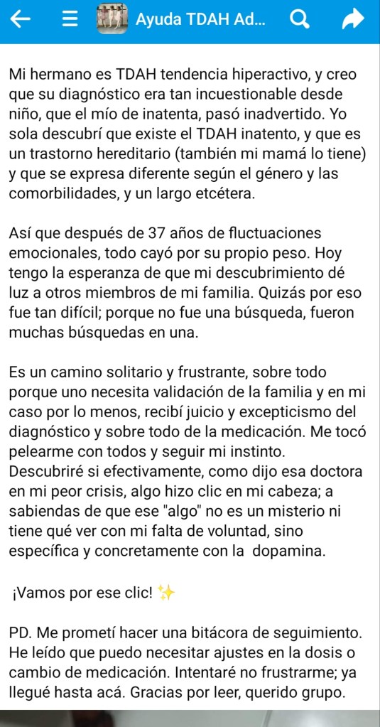 Me uní a un grupo en facebook llamado «Ayuda TDAH Adultos (Grupo de apoyo)». Esto ha significado mucho para mí en los momentos de duda, crisis o invalidación familiar. Nunca había pertenecido a una sociedad tan empática . Fue aquí donde surgió la idea y el apoyo para realizar esta bitácora. (Y nos llaman trastornados).