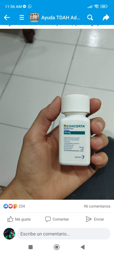 También tomo Venlafaxina, un antidepresivo que influye en la recaptación de serotonina y norepinefrina. Lo tomo hace aproximadamente un año; antes tomaba Sertralina (influye solo en la serotonina), pero el psiquiatra me lo cambió, SUPONGO, para descartar o confirmar un diagnóstico. Además consideró otros factores importantes; tuve una entrevista larga con él (unos 45 minutos) y supo que mi papá tiene una discapacidad crónico neurodegenerativa llamada Demencia Frontotemporal y que cuidarlo se vuelve cada vez más duro, además de tener una niña de 2 años, y pocas redes de apoyo para cuidar de ambos. Luego de darme seguimiento algunos meses por fin tuve mi diagnóstico; la Venlafaxina me daba energía y alguna estabilidad, pero comencé a desarrollar una compulsión a rascarme los granitos de la cara y mi frustración por proyectos inacabados crecía cada vez más. Laboralmente estancada, aislada y aún asi con todas las ganas de comerme al mundo, sabiendo mis capacidades.